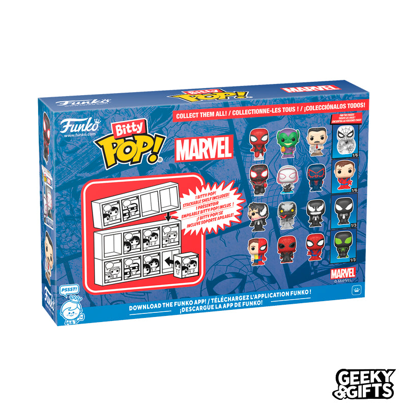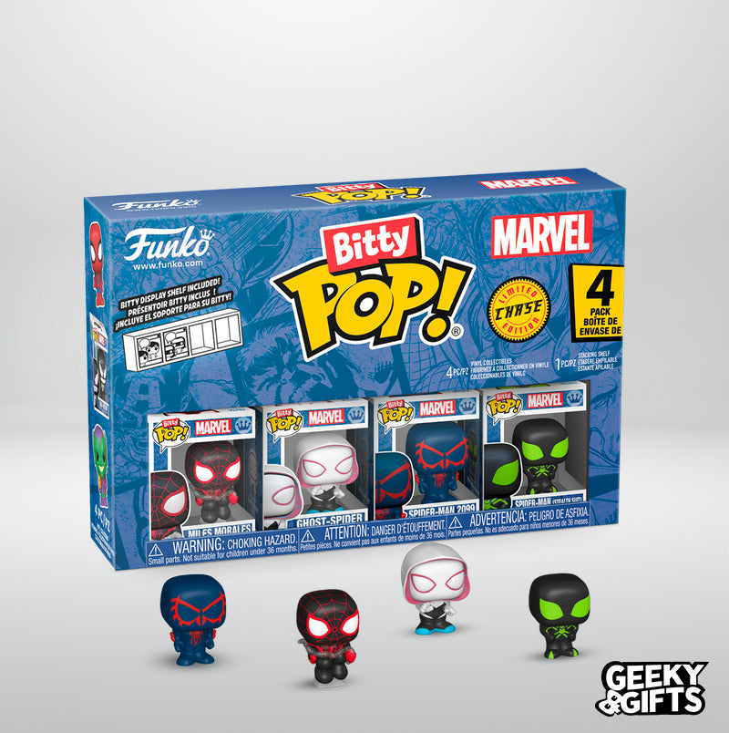 ¡Aumenta tu colección de Marvel con este 4-pack de Funko Bitty Pop! Incluye a Miles Morales, Ghost-Spider, Spider-Man 2099 y una edición especial. ¡Colecciona y muestra tus Bitty Pop con la caja de acrílico incluida! ¡Consigue tus personajes favoritos de Marvel en un tamaño más pequeño y adorable!